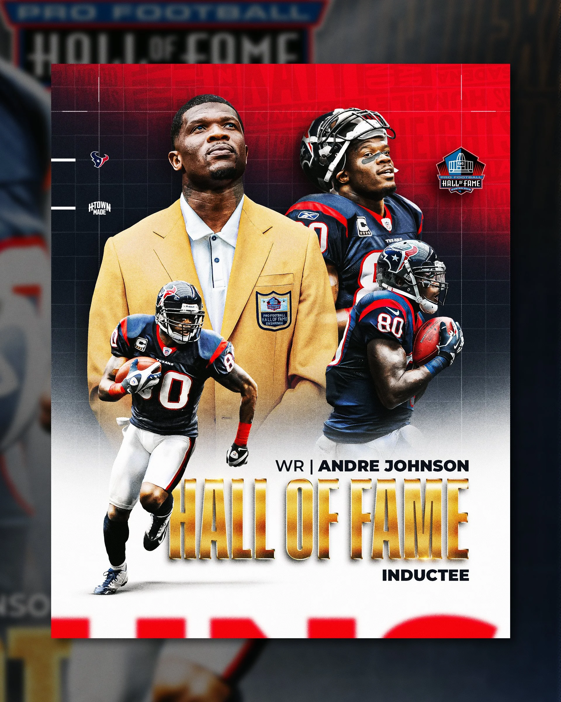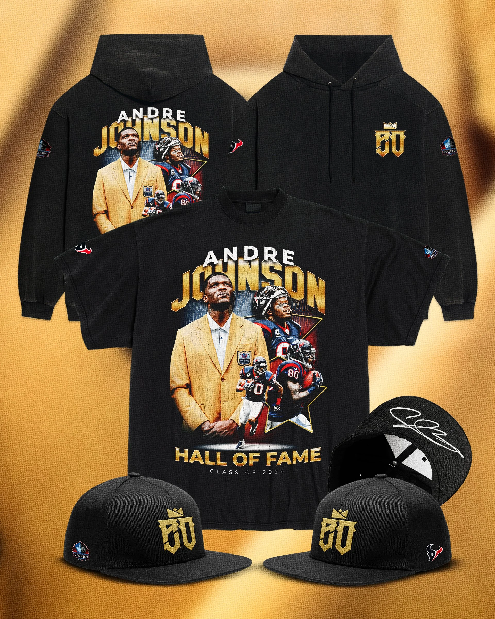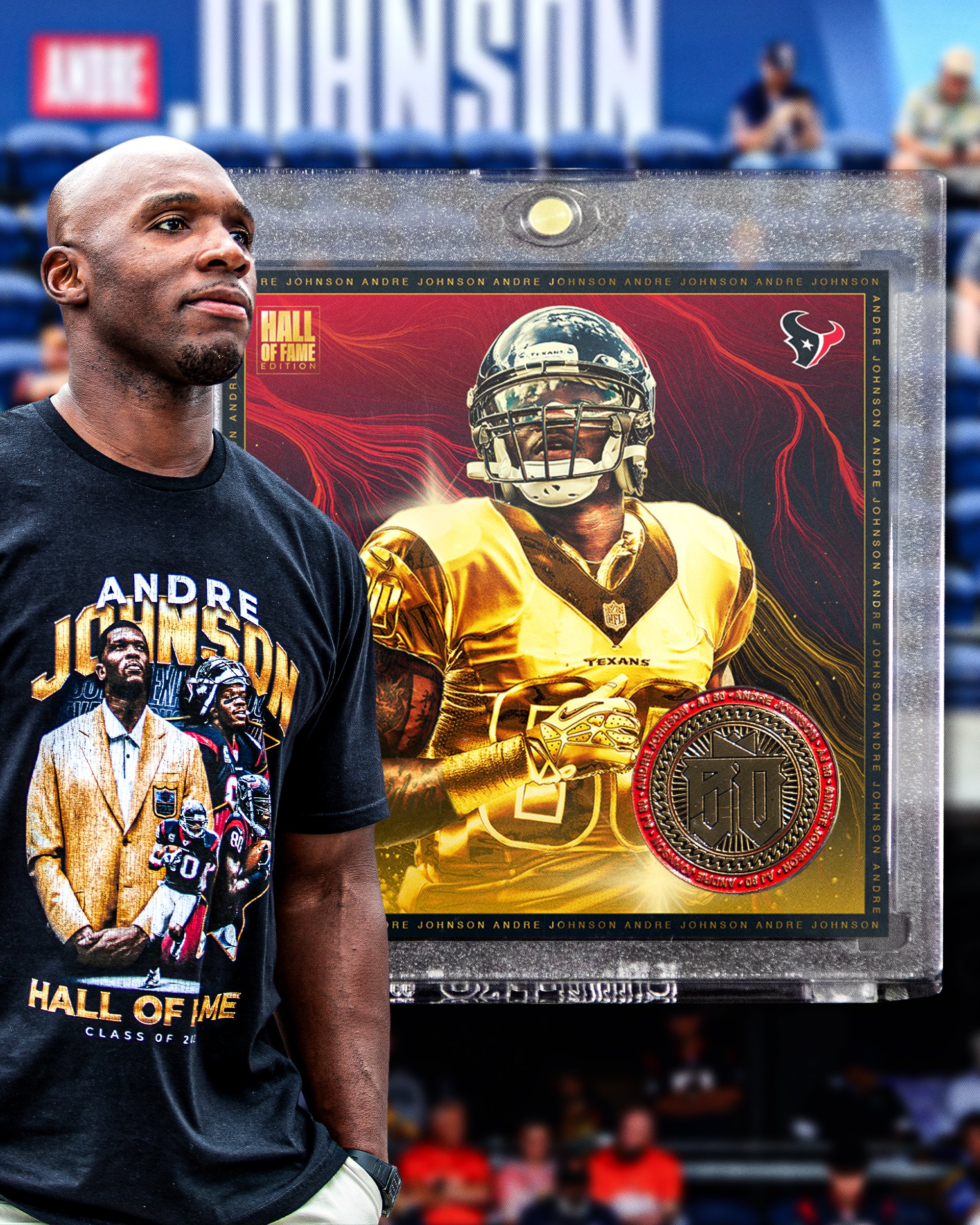 I led the creative direction for Andre Johnson’s Hall of Fame campaign, developing a cohesive visual system across multiple touch points. The project included social media graphics, event signage, retail merchandise (t-shirt, hoodie, and hat), and a commemorative game day trading card, each designed to celebrate his legacy while maintaining a unified and impactful brand presence.