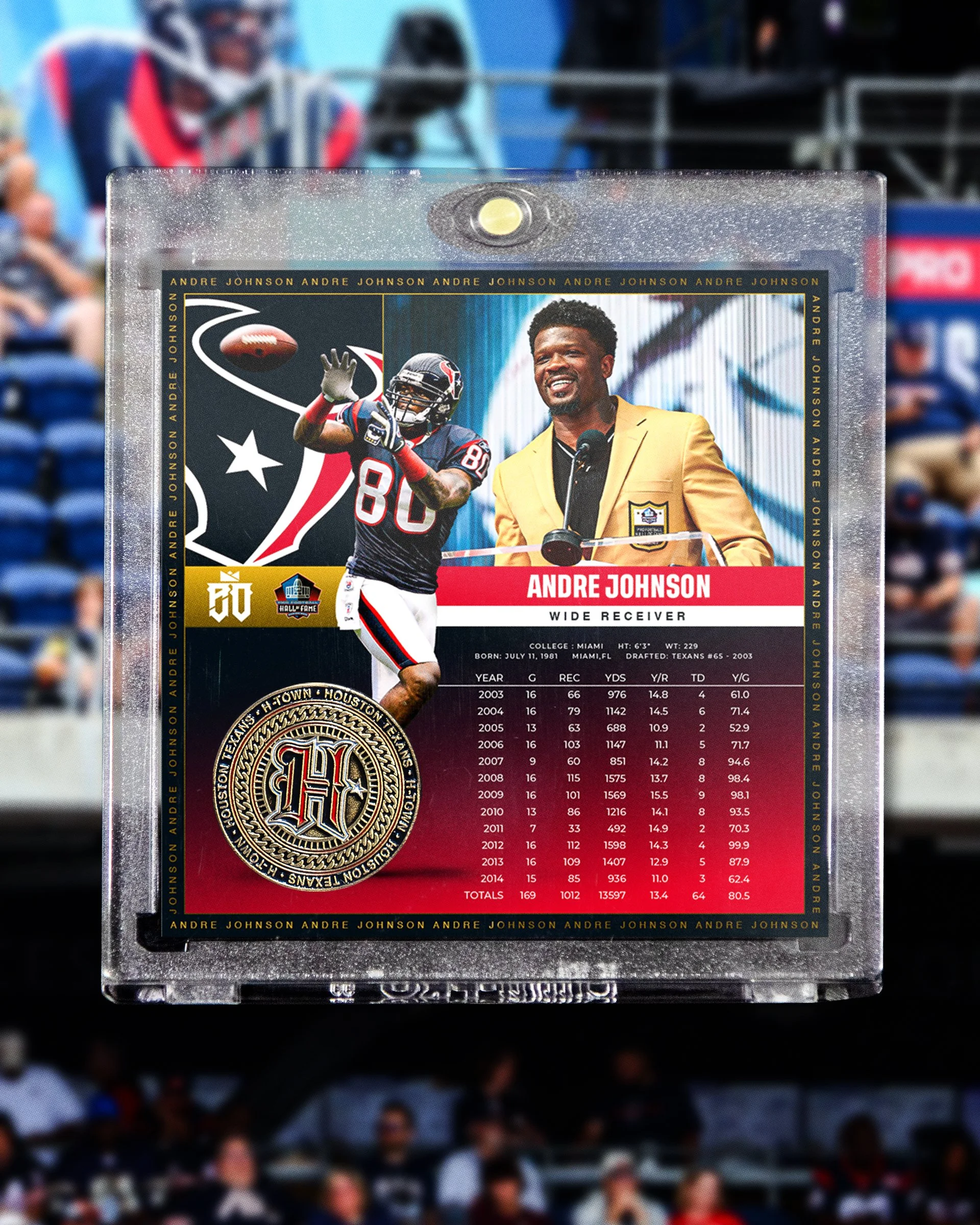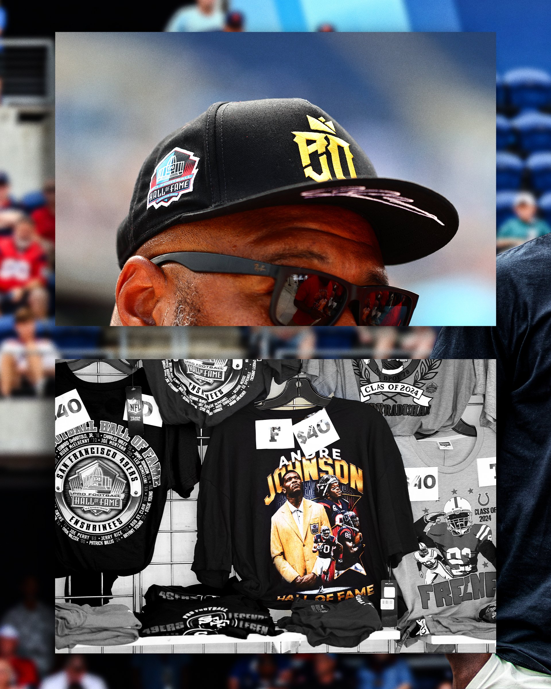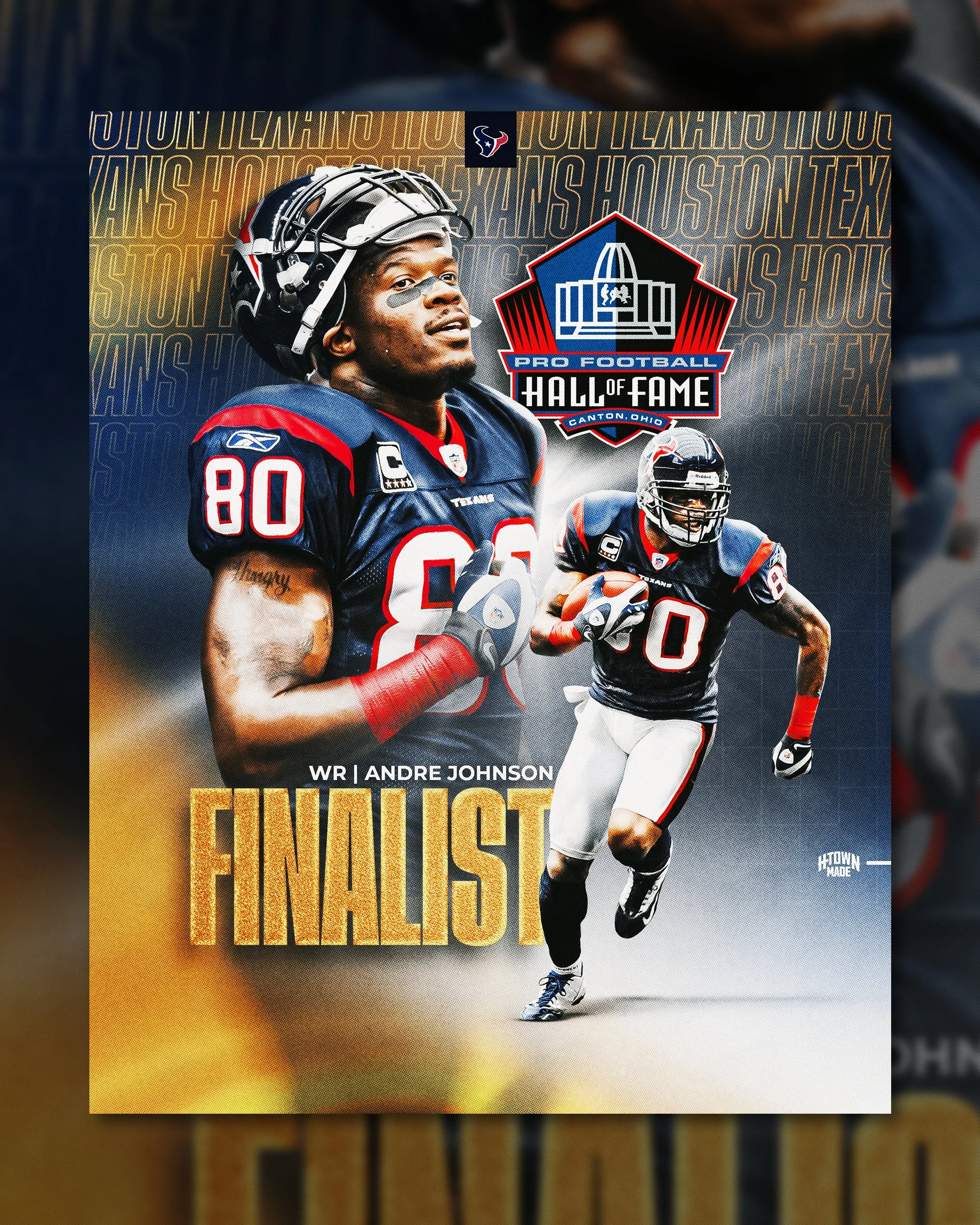 I led the creative direction for Andre Johnson’s Hall of Fame campaign, developing a cohesive visual system across multiple touch points. The project included social media graphics, event signage, retail merchandise (t-shirt, hoodie, and hat), and a commemorative game day trading card, each designed to celebrate his legacy while maintaining a unified and impactful brand presence.